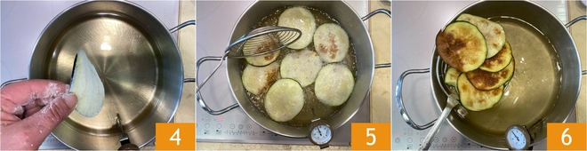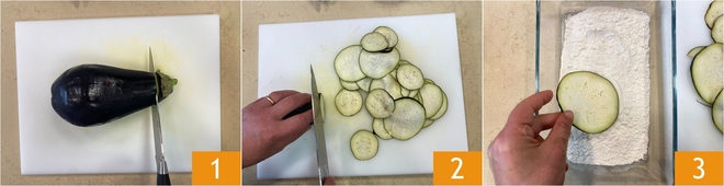 Um die frittierten Auberginen zuzubereiten, schneidet ihr zuerst die Enden ab 1, dann schneidet ihr sie in Scheiben von 2 mm Dicke 2. In der Zwischenzeit erhitzt ihr das Pflanzenöl in einem Topf, bis es 180 °C erreicht. Anschließend wendet ihr die Auberginenscheiben beidseitig in Mehl 3. Schüttelt das überschüssige Mehl gut ab.