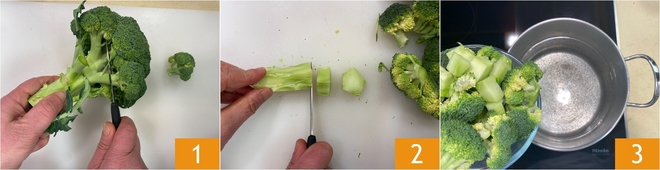 Um die frittierten Brokkoli-Fleischbällchen zuzubereiten, beginnen Sie mit der Reinigung des Brokkolis: Trennen Sie die Röschen 1, schälen Sie dann den Stiel und schneiden Sie ihn in Stücke 2. Alles in kochendes Wasser geben 3.\u00a0\u00a0<\/p>