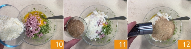 Fügen Sie auch den geriebenen Käse 10, die Semmelbrösel 11 und den Pfeffer 12 hinzu.<\/p>