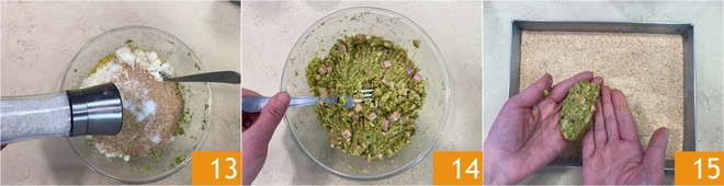 Salzen 13 und mischen, um eine homogene Masse zu erhalten 14. Nehmen Sie eine Portion der Masse von etwa 80 g und formen Sie ein ovales Fleischbällchen 15, dann wälzen Sie es in den Semmelbröseln.\u00a0<\/p>