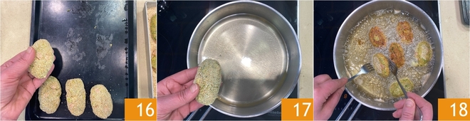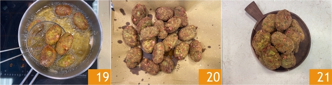 Während Sie die Fleischbällchen formen, legen Sie sie auf ein Tablett; mit diesen Mengen erhalten Sie etwa 16 Stück 16. Erhitzen Sie das Pflanzenöl in einem Topf, und wenn es 170°C erreicht hat, tauchen Sie die Fleischbällchen ein 17. Braten Sie sie etwa 5-7 Minuten lang und drehen Sie die Fleischbällchen während des Frittierens 18.\u00a0<\/p>