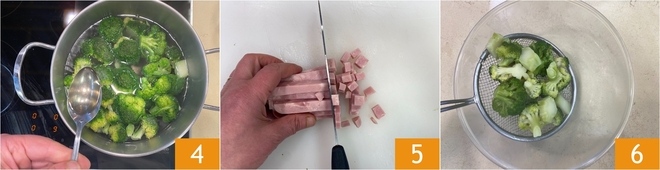 Fügen Sie einen Teelöffel Essig hinzu und kochen Sie für etwa 7-8 Minuten 4. In der Zwischenzeit schneiden Sie den Schinken in Würfel von etwa einem halben Zentimeter 5. Sobald der Brokkoli gekocht ist, lassen Sie ihn in einer Schüssel abtropfen 6.\u00a0<\/p>