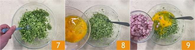 Zerdrücken Sie sie mit einer Gabel 7, dann fügen Sie die Eier 8 und die Schinkenwürfel 9 hinzu.<\/p>
