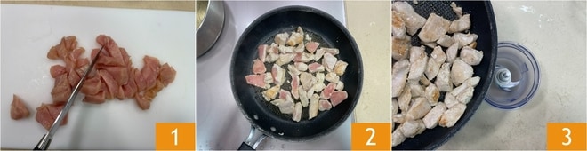 Um die frittierten Hähnchenröllchen mit Saucen und Gemüse zuzubereiten, schneidet zuerst die Hähnchenbrust in Stücke 1. Bratet sie in einer Antihaftpfanne 2 etwa zehn Minuten an, salzen und pfeffern. Kocht das Huhn, bis es gar ist, dann gebt die Stücke in einen Mixer 3.