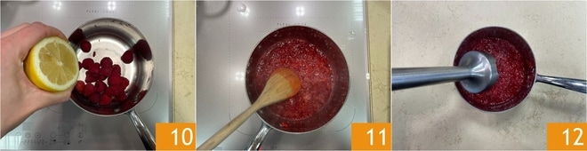 In der Zwischenzeit bereitet die verschiedenen Saucen vor. Beginnt mit der Himbeersauce. Gebt die Himbeeren in einen Topf, fügt den Zitronensaft 10 und das Wasser hinzu. Kocht bei mittlerer Hitze etwa 5 Minuten lang unter häufigem Rühren 11, bis sie zerfallen sind. Dann püriert mit einem Stabmixer 12.