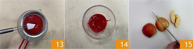 Siebt die gewonnene Sauce durch ein Sieb 13, dann stellt sie beiseite 14. Jetzt bereitet die Apfelsauce zu: Wascht sie, entfernt das Kerngehäuse und schneidet sie in Würfel 15.