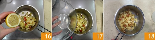 Fügt den Zitronensaft 16 und die Hälfte der Wassermenge 17 hinzu. Kocht sie dann, bis sie weich sind 18, etwa 10 Minuten.