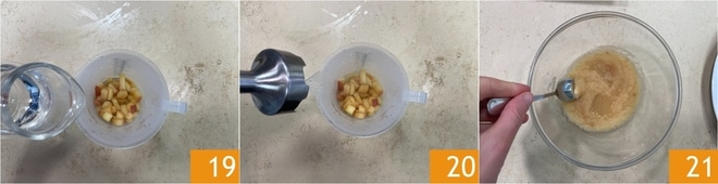 Fügt das restliche Wasser hinzu 19 und püriert die Äpfel 20. Ihr solltet eine cremige Konsistenz erhalten 21; stellt sie beiseite.
