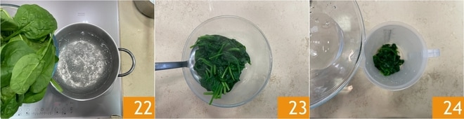 Blanchiert den Spinat kurz in gesalzenem Wasser 22. Abtropfen lassen und in Eiswasser tauchen 23. Nochmals abtropfen, in einen hohen, schmalen Behälter geben und das Wasser hinzufügen 24.