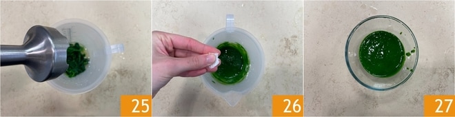Püriert mit einem Stabmixer 25, würzt mit Salz 26 und auch die Spinatsauce ist fertig 27.
