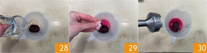 Bereitet die letzte Sauce vor. Gebt die Rote Bete in einen hohen, schmalen Behälter, fügt das Wasser hinzu 28, salzt 29 und püriert mit einem Stabmixer 30. Auch diese Sauce beiseite legen.