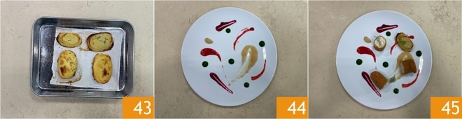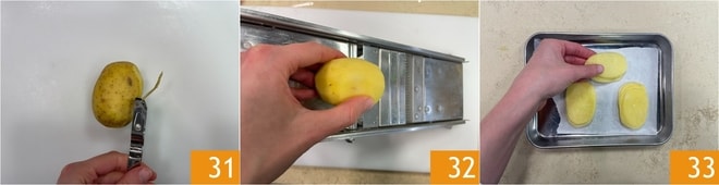 Widmet euch den Kartoffeln. Schälen 31 und waschen. Schneidet sie dünn mit einem Mandoline, um eine Dicke von ein paar mm zu erhalten 32. Fertigt 4 Türmchen aus je 10 Scheiben und legt sie auf ein mit Backpapier ausgelegtes Blech 33.