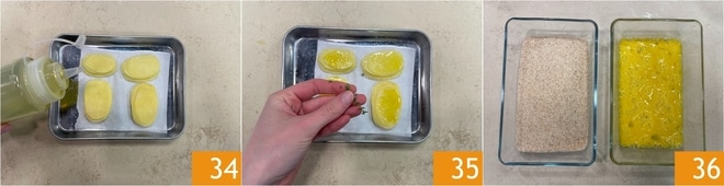 Würzt sie mit Salz, Öl 34 und Thymian 35. Backt bei 200 °C im vorgeheizten statischen Ofen für 30 Minuten. In der Zwischenzeit die Zutaten für die Panierung der Hähnchenröllchen vorbereiten. Gebt die Semmelbrösel in eine Schüssel und die verquirlten Eier in eine andere 36. Wenn die Kartoffeln fast fertig sind, beginnt ihr das Öl zu erhitzen, das eine Temperatur von 170-180 °C erreichen sollte.