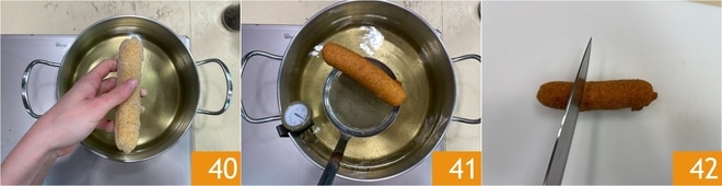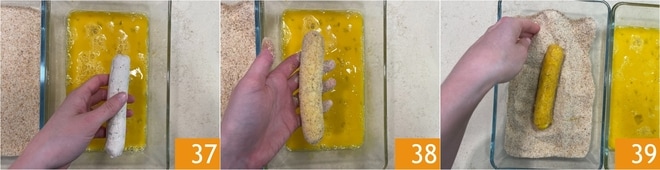 Während das Öl erhitzt wird, paniert die Röllchen. Taucht sie zuerst in das Ei 37, dann in die Semmelbrösel, dann nochmals in das Ei und zuletzt wieder in die Semmelbrösel 39; um eine doppelte Panierung zu machen.