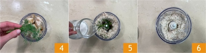 Fügt den Dill hinzu und püriert gut, dann gebt die Sahne dazu 5 und püriert weiter, bis eine cremige und homogene Masse entsteht 6.