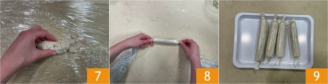 Mit Hilfe von Frischhaltefolie formt Zylinder, indem ihr etwa 100 g Masse in jeden einrollt 7, festzieht, an beiden Enden verknotet 8, auf ein Tablett legt 9 und für mindestens 1 Stunde in den Gefrierschrank stellt (dieser Schritt hilft euch, die Masse fester zu machen, um sie problemlos zu panieren).