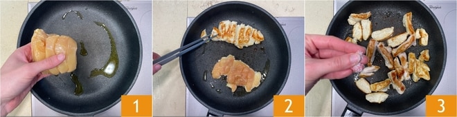 Um die frittierten Hühnerbällchen mit Kaviar und Trüffel zuzubereiten, beginnen Sie mit dem Garen des Huhns: Legen Sie die Hühnerbrüste in eine bereits heiße antihaftbeschichtete Pfanne mit einem Schuss Öl 1. Braten Sie das Huhn bei mittlerer Hitze etwa 5 Minuten pro Seite an, indem Sie es mit einer Küchenzange wenden 2. Fügen Sie eine Prise Salz hinzu 3.