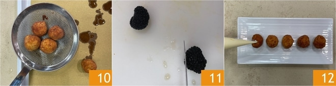 Sobald sie gleichmäßig goldbraun sind, lassen Sie die Bällchen auf Frittierpapier abtropfen 10. Schneiden Sie inzwischen den Trüffel in dünne Scheiben 11. Richten Sie die frittierten Hühnerbällchen an, indem Sie einen kleinen Klecks Mayonnaise unter jedes setzen und dasselbe obenauf tun 12.