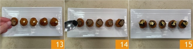 Legen Sie eine Trüffelscheibe auf jedes Bällchen, um den Mayonnaiseklecks zu bedecken 13, dann vervollständigen Sie das Ganze mit einer Prise Kaviar 14 und einem Goldblatt 15. Ihre frittierten Hühnerbällchen mit Kaviar und Trüffel sind bereit zum Servieren!