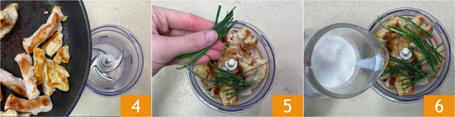 Geben Sie die Hühnerbrust in einen Mixer 4, fügen Sie dann den Schnittlauch 5 und die Sahne hinzu 6. Mixen Sie, bis Sie eine weiche und homogene Masse erhalten.