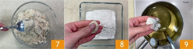 Formen Sie mit Hilfe eines Teelöffels kleine Bällchen 7 und wälzen Sie sie nach und nach im Mehl 8. Erhitzen Sie das Pflanzenöl in einem kleinen Topf auf eine Temperatur von 180°-190° und frittieren Sie wenige Bällchen gleichzeitig 9.