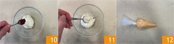 Während Sie die Maiskolben frittieren, können Sie sich der scharfen Sauce widmen: Geben Sie die Mayonnaise in eine Schüssel und fügen Sie die Chilipaste hinzu 10. Mischen Sie alles und geben Sie es in einen Spritzbeutel 12.