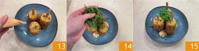 Zum Anrichten platzieren Sie die Maiskolben mit dem Stab nach oben, drücken Sie einige Kleckse Chili-Mayonnaise 13 und garnieren Sie mit Rucola 14, Dill und Schnittlauch. Hier sind Ihre frittierten Maiskolben, genießen Sie sie sofort 15!
