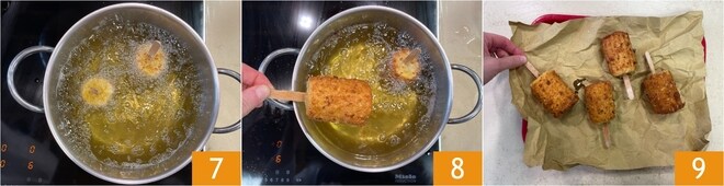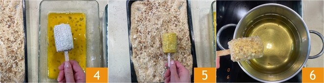 Dann in verquirlten Eiern 4 und schließlich in Paniermehl 5 wenden. Frittieren Sie 1-2 Stücke gleichzeitig in Öl bei 170° für etwa 5-7 Minuten 6.