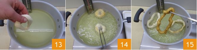 Nach der erforderlichen Zeit für das Aufgehen, nehmen Sie den Teig und schneiden Sie kleine Stücke von etwa 25-30 g Gewicht ab 10. Ölen Sie Ihre Hände mit 10 g Öl 11, um den Teig formen zu können und ihm die gewünschte Form zu geben 12. Wir empfehlen die Form eines Rings, indem Sie jedes Teigstück nehmen, die Mitte mit den Fingern durchstechen und weiter ausweiten.