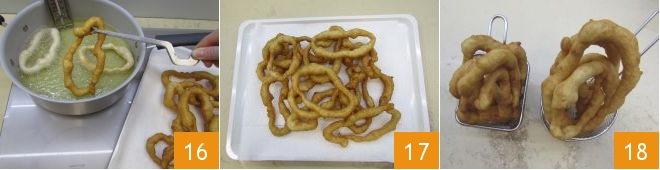 Wenn sie frittiert sind, legen Sie sie mit Hilfe einer Küchenzange auf saugfähiges Papier, um überschüssiges Öl abzugeben 16. Wiederholen Sie diesen Vorgang für alle vorbereiteten Ringe 17. Wenn sie das überschüssige Öl abgegeben haben, salzen Sie Ihre Crispelle nach Belieben und servieren Sie sie sofort 18.
