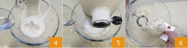 Gießen Sie nun den aufgelösten Zucker in die Schüssel mit Mehl und Hefe 4, fügen Sie das Wasser hinzu und beginnen Sie mit einem Planetenrührer und einem Haken, alle Elemente zu vermischen, indem Sie nach und nach Wasser hinzufügen 5, bis eine homogene Masse entsteht, in der die Flüssigkeiten aufgenommen wurden 6.