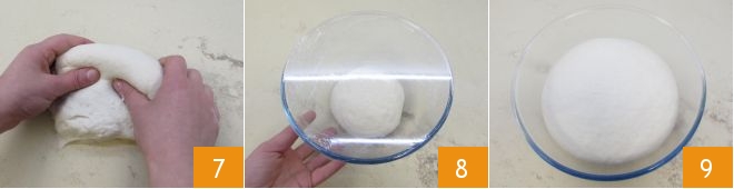 Übertragen Sie den Teig dann auf eine Arbeitsfläche und kneten Sie ihn mindestens 10 Minuten lang, bis er glatt ist 7. Arbeiten Sie den Teig weiter, bis Sie eine kugelförmige Form erhalten 8. Wenn Sie eine Kugel mit gleichmäßigem Teig erhalten haben, legen Sie sie in eine leicht bemehlte Schüssel, damit der Teig nicht klebt, decken Sie sie mit Frischhaltefolie ab und lassen Sie sie in einer warmen, zugfreien Umgebung mindestens zwei Stunden aufgehen, oder bis der Teig sein Volumen verdoppelt hat 9.