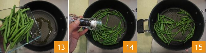 In der Zwischenzeit kümmern Sie sich um die grünen Bohnen. Geben Sie einen Schuss Öl in eine Pfanne, fügen Sie die grünen Bohnen hinzu 13, salzen, pfeffern 14 und braten Sie sie bei starker Hitze etwa 5 Minuten lang 15.