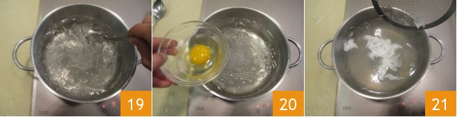 Jetzt können Sie Ihre Pochierte Eier zubereiten. Geben Sie Wasser in einen großen Topf, erhitzen Sie es und geben Sie Essig hinzu. Wenn das Wasser leicht zu kochen beginnt, erzeugen Sie mit einem Löffel einen Wirbel 19, indem Sie immer in die gleiche Richtung rühren. Geben Sie dann das Ei in die Mitte, am besten brechen Sie es vorher in eine kleine Schüssel 20. Kochen Sie das Ei auf diese Weise 2 Minuten lang, ohne es zu rühren oder zu bewegen 21.