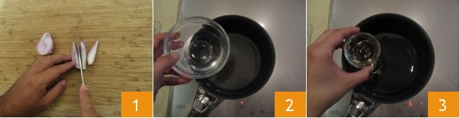 Um das frittierte pochierte Ei mit Gemüse, Speck und Sauce Béarnaise zuzubereiten, schälen Sie zunächst die Schalotte und schneiden sie in Spalten 1. Gießen Sie dann Wasser 2 und Essig 3 in einen kleinen Topf.