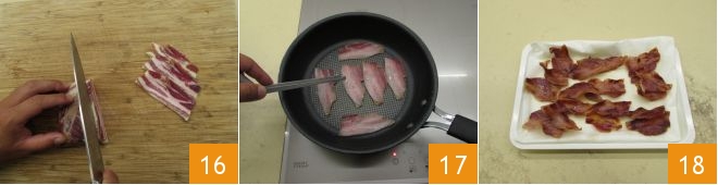 In der Zwischenzeit kümmern Sie sich auch um den Speck. Schneiden Sie ihn in dünne Scheiben von etwa 1,5 mm Dicke 16 und braten Sie sie in einer heißen Pfanne 17. Wenn sie goldbraun sind, legen Sie sie auf ein Blatt Küchenpapier 18.