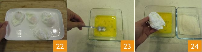 und wenden Sie es mit einem Löffel, damit es vollständig bedeckt ist 25. Wälzen Sie es dann im Paniermehl 26 und entfernen Sie überschüssiges Paniermehl mit einem Schaumlöffel 27.