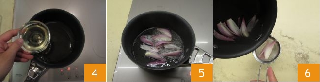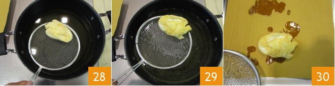 Frittieren Sie sie nacheinander in heißem Öl bei 190°C 28, messen Sie die Temperatur mit einem Küchenthermometer. Es dauert nur wenige Augenblicke für jedes Ei. Sobald die Oberfläche goldbraun ist, schöpfen Sie das Ei ab 29 und legen es auf ein Tablett mit Küchenpapier 30.