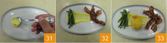 Frittieren Sie alle Eier 28 und richten Sie das Gericht an. Verteilen Sie etwas Sauce Béarnaise in der Mitte 31, legen Sie den Speck und die grünen Bohnen an die beiden Seiten des Tellers 32 und zuletzt das Ei auf die Sauce 33.