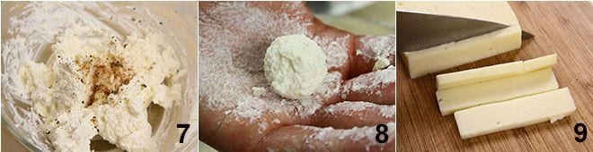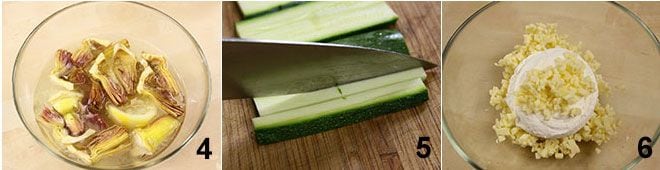 Reinigen Sie jetzt die Artischocken gemäß den Anweisungen, die Sie Wie man Artischocken putzt, schneiden Sie sie in Viertel und legen Sie sie in eine Schüssel mit Wasser und Zitrone, um zu verhindern, dass sie sich verfärben 4. Waschen Sie die Zucchini und schneiden Sie sie in dünne Scheiben 5. Jetzt bereiten Sie die Käse vor: Geben Sie Ricotta, fein geschnittene Käsescheiben und 2 Esslöffel geriebenen Provolone, Mehl, Salz, Pfeffer und Muskatnuss in eine große Schüssel 6.