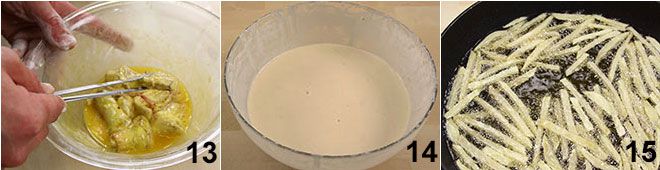 Verfahren Sie auf die gleiche Weise mit der Hälfte der Artischocken 13. Jetzt bereiten Sie den Teig vor: Geben Sie Wasser in eine Schüssel und fügen Sie nach und nach das Mehl hinzu, während Sie mit einem Schneebesen rühren, damit sich keine Klumpen bilden 14, lassen Sie den Teig etwa eine halbe Stunde im Kühlschrank ruhen. Alles ist bereit zum Frittieren: Stellen Sie eine große Pfanne mit reichlich Pflanzenöl auf den Herd, sobald das Öl heiß ist, beginnen Sie mit dem Frittieren der Kartoffeln 15 und lassen Sie sie auf Küchenpapier abtropfen.