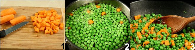 Um die fröhlichen Omeletts zuzubereiten, schneiden Sie zuerst die Karotten 1 in kleine Würfel und blanchieren Sie sie dann 2/3 Minuten zusammen mit den Erbsen 2 in kochendem Salzwasser. In einer Antihaftpfanne das fein gehackte Schalotten mit wenig Öl anbraten, wenn es zu bräunen beginnt, die Erbsen und Karotten 3 hinzufügen und einige Minuten aromatisieren lassen. Fein gehackte Petersilie einarbeiten.