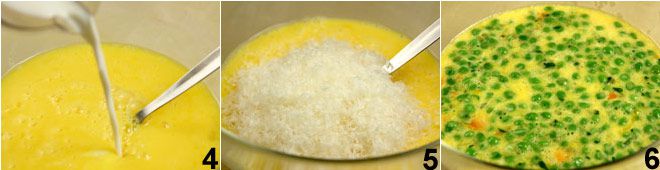 In einer Schüssel die 6 Eier mit einer Gabel verquirlen, die Milch 4 und den geriebenen Grana Padano 5 einarbeiten, alles vermischen und mit Salz und Pfeffer abschmecken. Fügen Sie dem Gemisch die Mischung aus Karotten und Erbsen 6 hinzu.