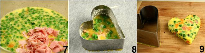 Fügen Sie auch den gekochten Schinken 7 in Stückchen hinzu und mischen Sie gut. Legen Sie ein Blatt Backpapier auf ein Backblech und stellen Sie Metallformen (Ausstecher) in den gewünschten Formen darauf, wir haben Herzformen verwendet. Diese gut innen mit Butter einfetten und mit Mehl bestäuben und dann die Eier- und Gemüsemischung 8 bis zu einer Höhe von etwa 2 cm einfüllen. Im Umluftofen bei 190°C etwa 20 Minuten backen. Aus dem Ofen nehmen und die fröhlichen Omeletts mit Hilfe eines Messers aus den Metallformen 9 herausnehmen, dabei darauf achten, sie nicht zu zerbrechen. Servieren Sie die fröhlichen Omeletts lauwarm mit einem Tomatensalat.