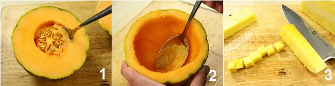 Um den Obstsalat zuzubereiten, halbiert die Melone längs zur Faser, entfernt mit einem Löffel die inneren Kerne 1 und formt mit dem passenden Werkzeug Kugeln aus dem Fruchtfleisch (klickt hier, um zu sehen, wie). Höhlt das Meloneninnere mit einem Löffel gründlich aus, und ihr könnt die Schale dann als originelle Schüssel für euren Obstsalat verwenden 2. Schält die Ananas und würfelt das Fruchtfleisch (klickt hier, um zu sehen, wie) 3.<\/p>