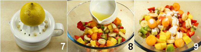 Presst den Saft einer Zitrone aus 7 und gebt ihn zur Frucht 8, fügt dann auch den Zucker hinzu 9 und rührt erneut vorsichtig um. Lasst den Obstsalat etwa eine Stunde ziehen.<\/p>