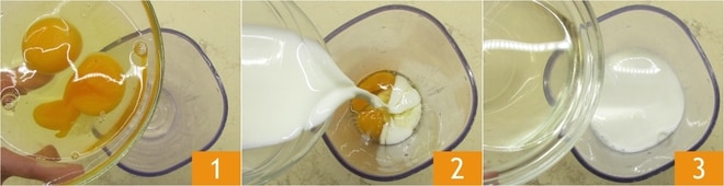 Um die Frühlings-Crespelle zuzubereiten, kochen Sie zuerst den Spinat in kochendem Wasser und drücken ihn gut aus, um die überschüssige Flüssigkeit zu entfernen. Machen Sie mit dem Teig für die Crêpes weiter: Geben Sie die Eier in einen hohen, schmalen Behälter 1, fügen Sie dann die Milch 2 und das Pflanzenöl 3 hinzu.