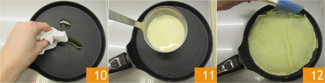 Erhitzen Sie eine antihaftbeschichtete Pfanne mit einem Durchmesser von etwa 18 cm bei mittlerer bis niedriger Hitze und ölen Sie sie leicht ein 10, dann geben Sie eine Kelle des klassischen Teigs in die Mitte 11 und drehen Sie die Pfanne, um den Teig gleichmäßig zu verteilen. Wenn sich die Ränder zu lösen beginnen, drehen Sie die Crespella mit einem Spatel 12 und kochen Sie sie auch auf der anderen Seite eine Minute lang.