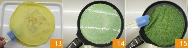 Stapeln Sie die fertigen Crêpes auf einem Tablett 13. Fahren Sie mit dem Kochen der grünen Crespelle fort, indem Sie auf die gleiche Weise vorgehen: Die Pfanne einfetten, eine Kelle des Teigs in die Mitte geben und verteilen 14, dann auf beiden Seiten insgesamt ein paar Minuten kochen 15. Bedecken Sie die Crespelle mit Frischhaltefolie und fahren Sie mit der Zubereitung der Füllung fort.