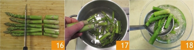 Reinigen Sie den Spargel, indem Sie das holzige Ende des Stängels entfernen, und teilen Sie ihn dann in 3 Teile 16. Blanchieren Sie den Spargel für 2-3 Minuten in kochendem Salzwasser 17, dann geben Sie ihn in eine Schüssel mit kaltem Wasser und Eis, um die Farbe zu erhalten 18.